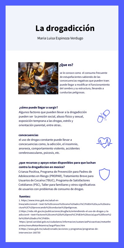 1. https://www.imss.gob.mx/salud-en-linea/adicciones#:~:text=Se%20conoce%20como%20adicci%C3%B3n%20a,su%20estructura%2C%20provocando%20conductas%20peligrosas.2.https://nida.nih.gov/es/publicaciones/drugfacts/entendiendo-el-uso-de-drogas-y-la-adiccion#:~:text=Factores%20como%20la%20presi%C3%B3n%20social,que%20lleve%20a%20la%20adicci%C3%B3n. https://pnsd.sanidad.gob.es/ciudadanos/informacion/sustanciasPsicoactivas/metanfetamina/menuMetanfetamina/largoPlazo.htm 4.https://www.gob.mx/salud/conadic/acciones-y-programas/programas-de-intervencion-160730
