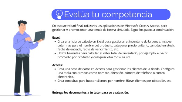 En esta actividad final, utilizarás las aplicaciones de Microsoft: Excel y Access, para gestionar y promocionar una tienda de forma simulada. Sigue los pasos a continuación: