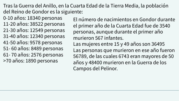 Tras la Guerra del Anillo, en la Cuarta Edad de la Tierra Media, la población del Reino de Gondor es la siguiente: 0-10 años: 18340 personas 11-20 años: 38522 personas 21-30 años: 12549 personas 31-40 años: 12340 personas 41-50 años: 9578 personas 51- 60 años: 8489 personas 61- 70 años: 2576 personas >70 años: 1890 personas