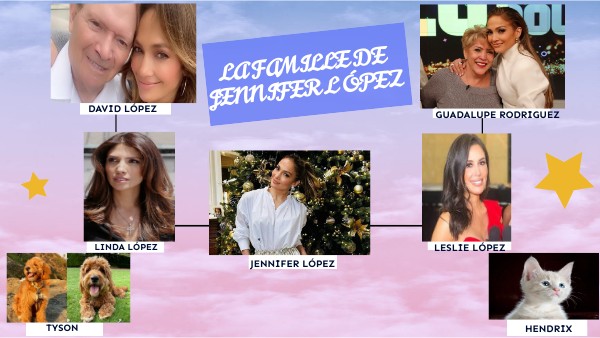 C'est la famille de Jennifer López: Sa père s'appelle David López. Il a été scienceliste pendant 20 ans. Sa mère s'appelle Guadalupe Rodriguez. Elle a était institutrice de maternelle.Leslie est la soeur aînée de Jennifer López. Elle a 55 ans et en plus d'être enseignante, elle est enseignante, elle est chanteuse d'opéra. Linda est la plus jeune des trois, elle a 49 ans et est une journaliste renommé. Il aussi un chien nommé Tyson et un chat appelé Hendrix. AUVOIR!!!