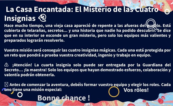 Hace mucho tiempo, una vieja casa apareció de repente a las afueras del pueblo. Está cubierta de telarañas, secretos... y una historia que nadie ha podido descubrir. Se dice que en su interior se esconde un gran misterio, pero solo los equipos más valientes y preparados lograrán resolverlo. Vuestra misión será conseguir las cuatro insignias mágicas. Cada una está protegida por un reto que pondrá a prueba vuestra creatividad, ingenio y trabajo en equipo. ⚠️ ¡Atención! La cuarta insignia solo puede ser entregada por la Guardiana del Secreto… ¡la maestra! Solo los equipos que hayan demostrado esfuerzo, colaboración y valentía podrán obtenerla. 🧩 Antes de comenzar la aventura, debéis formar vuestro equipo y elegir los roles. Cada uno tiene una misión especial: