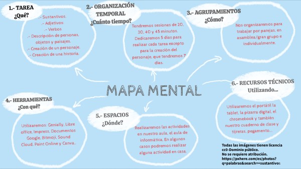 TAREAS: ¿Cómo?.- SUSTANTIVOS: Por parejas..- ADJETIVOS: Por parejas..- VERBOS: Por parejas..- DESCRIPCIONES (personas, objetos y paisajes): Grangrupo/asamblea..- CREACIÓN PERSONAJE: Por parejas y grangrupo-asamblea..- CREACIÓN DE HISTORIA: Individual.