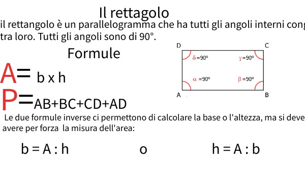 il rettangolo è un parallelogramma che ha tutti gli angoli interni congruenti tra loro. Tutti gli angoli sono di 90°.