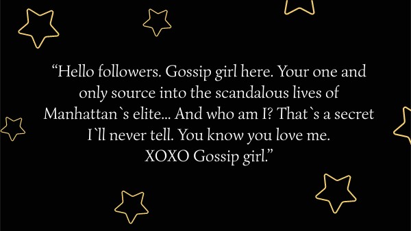 “Hello followers. Gossip girl here. Your one and only source into the scandalous lives of Manhattan`s elite... And who am I? That`s a secret I`ll never tell. You know you love me. XOXO Gossip girl.”
