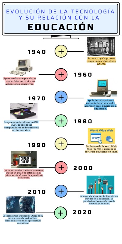 2020s: Continúa la expansión de la educación en línea. Se exploran tecnologías emergentes como la realidad aumentada y virtual. La inteligencia artificial se utiliza cada vez más para la evaluación y personalización del aprendizaje. Continúa el desarrollo de la computación cuántica, la inteligencia artificial y la conectividad 5G.
