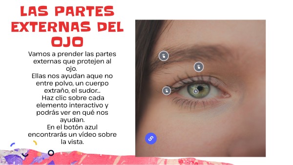 Vamos a prender las partes externas que protejen al ojo. Ellas nos ayudan aque no entre polvo, un cuerpo extraño, el sudor... Haz clic sobre cada elemento interactivo y podrás ver en qué nos ayudan. En el botón azul encontrarás un vídeo sobre la vista.