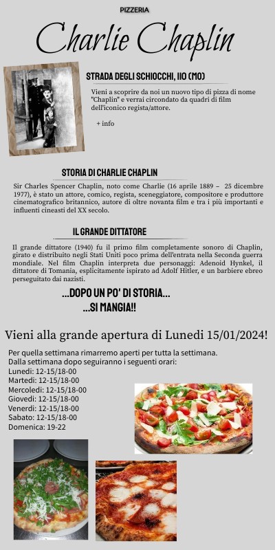 Vieni a scoprire da noi un nuovo tipo di pizza di nome "Chaplin" e verrai circondato da quadri di film dell'iconico regista/attore.