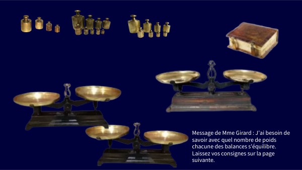 Message de Mme Girard : J'ai besoin de savoir avec quel nombre de poids chacune des balances s'équilibre. Laissez vos consignes sur la page suivante.