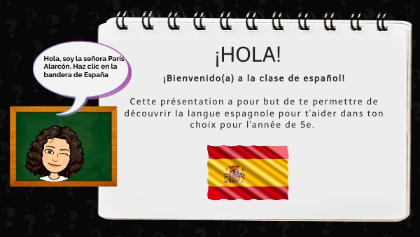 ¡Bienvenido(a) a la clase de español! Cette présentation a pour but de te permettre de découvrir la langue espagnole pour t'aider dans ton choix pour l'année de 5e.