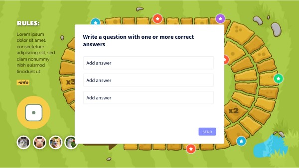 - IMPORTANT! These instructions are for guidance only. Feel free to edit the game in your own way and assign "prizes" or "punishments" to the different squares according to your preferences.