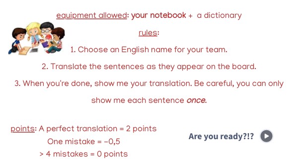 equipment allowed: your notebook + a dictionaryrules: 1. Choose an English name for your team. 2. Translate the sentences as they appear on the board. 3. When you're done, show me your translation. Be careful, you can only show me each sentence once.