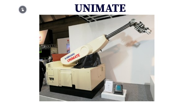 Unimate s'agit d'un bras articulé capable de tranférer des objet d'un endroit à un autre. Il a été inspirer des téléopérateurs utilisés dans l'industrie nucléaire. En 1961, le robot Unimate pointe pour la première fois à l'usine grâce à Général Motor,puis en 1976, la première entreprise à adopter Unimate est Renault.