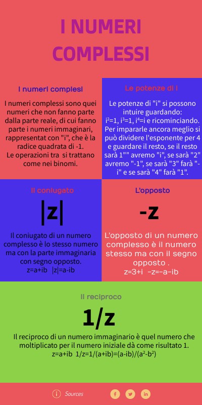 I numeri complessi sono quei numeri che non fanno parte dalla parte reale, di cui fanno parte i numeri immaginari, rappresentat con "i", che è la radice quadrata di -1. Le operazioni tra si trattano come nei binomi.