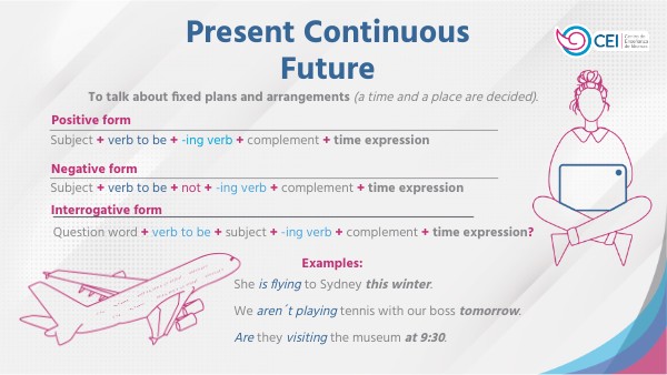 She is flying to Sydney this winter. We aren´t playing tennis with our boss tomorrow. Are they visiting the museum at 9:30.