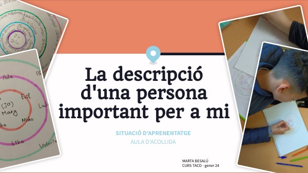 Per aconseguir-ho es proposa una sèrie d’activitats per tal de descobrir i conèixer el lèxic relacionat amb la família i la descripció de persones, les estructures de frases, les característiques del text descriptiu així com el procés d’escriptura (planificació, redacció i revisió). A partir del coneixement adquirit en aquestes activitats, cada alumne crea el seu cercle de persones importants i d’entre aquestes, n’escull una, que serà de qui en farà una descripció i la compartirà amb la resta de companys/es de l’Aula d’Acollida.