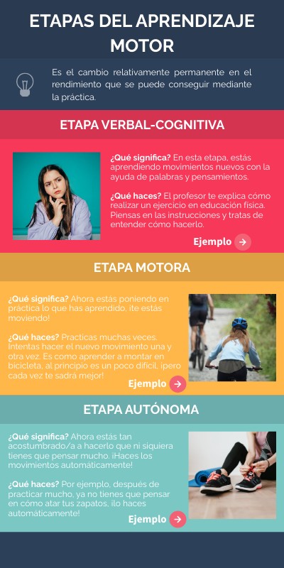 ¿Qué significa? En esta etapa, estás aprendiendo movimientos nuevos con la ayuda de palabras y pensamientos. ¿Qué haces? El profesor te explica cómo realizar un ejercicio en educación física. Piensas en las instrucciones y tratas de entender cómo hacerlo.