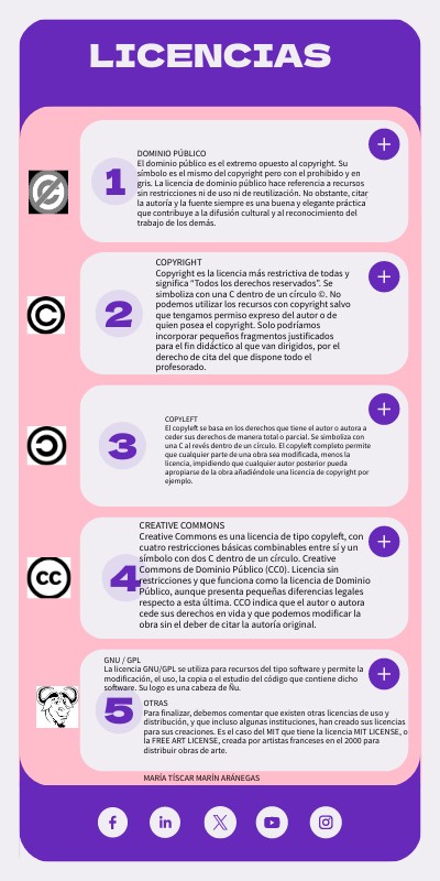 OTRAS Para finalizar, debemos comentar que existen otras licencias de uso y distribución, y que incluso algunas instituciones, han creado sus licencias para sus creaciones. Es el caso del MIT que tiene la licencia MIT LICENSE, o la FREE ART LICENSE, creada por artistas franceses en el 2000 para distribuir obras de arte. MARÍA TÍSCAR MARÍN ARÁNEGAS