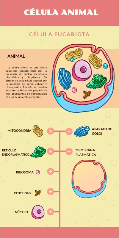 . La célula animal es una célula eucariota caracterizada por la presencia de núcleo, membrana plasmática y citoplasma. Se diferencia de la célula vegetal por la ausencia de pared celular y cloroplastos. Además se pueden encontrar células más pequeñas y más abundantes en comparación con las de una célula vegetal.