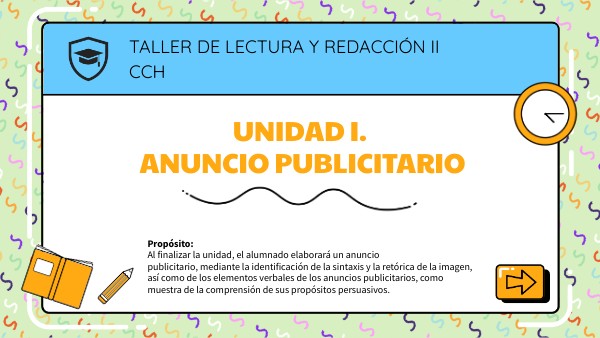 Propósito: Al finalizar la unidad, el alumnado elaborará un anuncio publicitario, mediante la identificación de la sintaxis y la retórica de la imagen, así como de los elementos verbales de los anuncios publicitarios, como muestra de la comprensión de sus propósitos persuasivos.