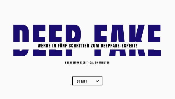 Möchtest du zum Deepfake-Expert in nur fünf Schritten werden? Lies dir die Tooltips jedes Kapitels aufmerksam durch (Beginne mit Kapitel 1: Einsatzzwecke von Deepfakes). Die Tooltips erscheinen entweder, wenn du mit dem Mauszeiger über die Kapitelelemente auf der Startseite fährst oder in den einzelnen Kapiteln oben rechts auf das "i"-Symbol klickst. Sobald ein Kapitel abgeschlossen ist, gelangst du automatisch zum nächsten, indem du einfach weiterklickst. Wenn du zurück zur Startseite möchtest, um einen Schritt zu wiederholen oder dich umzusehen, kannst du oben rechts auf den Home-Button klicken.