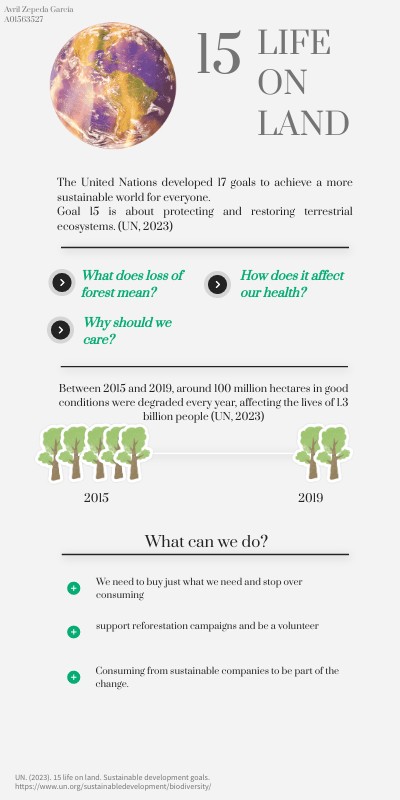 The United Nations developed 17 goals to achieve a more sustainable world for everyone.Goal 15 is about protecting and restoring terrestrial ecosystems. (UN, 2023)