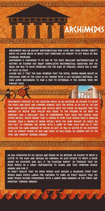 Archimedes was an ancient mathematician who lived 200 years before Christ’s birth. He loved math so much that sometimes he forgot to eat while he was figuring problems. Archimedes is considered to be one of the most brilliant mathematicians in history. He figured out many complicated mathematical equations. but his main job was to solve problems for the King of Syracuse, which was a part of Sicily in Italy. Legend has it that the king worried that the royal crown maker might be replacing some of the gold in his crowns with a less valuable material. The king asked Archimedes to find a way to determine if the crowns were 100 percent gold.