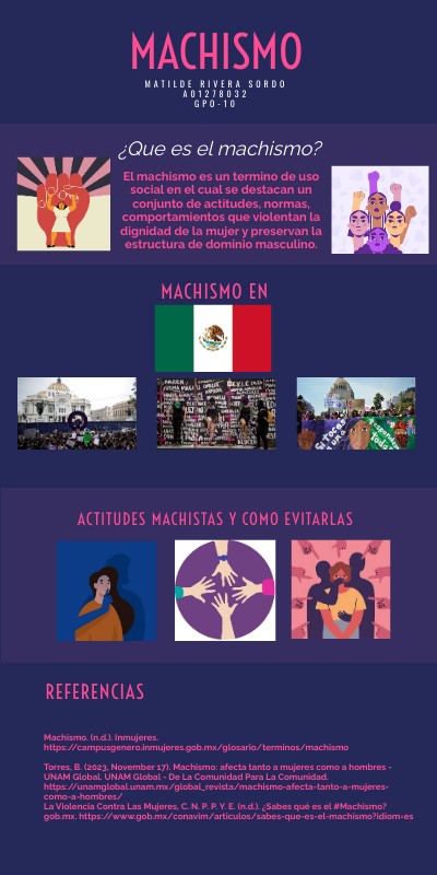 Machismo. (n.d.). Inmujeres. https://campusgenero.inmujeres.gob.mx/glosario/terminos/machismo Torres, B. (2023, November 17). Machismo: afecta tanto a mujeres como a hombres - UNAM Global. UNAM Global - De La Comunidad Para La Comunidad. https://unamglobal.unam.mx/global_revista/machismo-afecta-tanto-a-mujeres-como-a-hombres/La Violencia Contra Las Mujeres, C. N. P. P. Y. E. (n.d.). ¿Sabes qué es el #Machismo? gob.mx. https://www.gob.mx/conavim/articulos/sabes-que-es-el-machismo?idiom=es