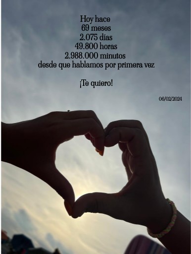 Hoy hace 69 meses 2.075 días 49.800 horas 2.988.000 minutos desde que hablamos por primera vez ¡Te quiero!