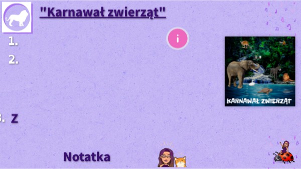 Poniżej znajduje sie 13 miniatur z cyklu " Karnawał zwierząt". Posłuchaj każdego utworu do końca izapisz który tytuł pasuje do odpowiedniego muzycznego obrazu.