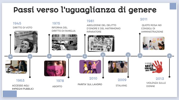 Un’altra importante conquista per la parità di genere avviene nel 1963, anno in cui il parlamento italiano ammette le donne ai pubblici uffici e alle professioni ed impieghi pubblici, compresa la magistratura, senza limitazioni per ciò che riguarda le mansioni e la carriera.