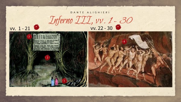 Il canto 3 dell'Inferno si ambienta nell'Antinferno (detto anche Vestibolo) da cui si sentono urla e pianti. Dante e Virgilio giungono di fronte alla porta dell'Inferno che, sulla sommità, reca un’iscrizione minacciosa in caratteri scuri.