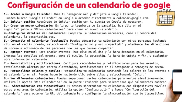 1.- Aceder a Google Calendar: Abre tu navegador web y dirígete a Google Calendar. Puedes buscar "Google Calendar" en Google o acceder directamente a calendar.google.com. 2.- Iniciar sesión: Asegúrate de iniciar sesión con tu cuenta de Google de educarex. 3.- Crear un nuevo calendario: En la parte izquierda de la pantalla, haz clic en el signo "+" junto a "Otros calendarios" para crear un nuevo calendario. 4.-Configurar detalles del calendario: Completa la información necesaria, como el nombre del calendario, la descripción,etc. 5.- Compartir el calendario (opcional): Puedes compartir tu calendario con otras personas haciendo clic en el recién creado, seleccionando "Configuración y uso compartido" y añadiendo las direcciones de correo electrónico de las personas con las que deseas compartir. 6.- Agregar eventos: Para añadir eventos, haz clic en el día y la hora deseados en el calendario. Ingresa los detalles del evento, como el título, la ubicación, la hora de inicio y fin, y cualquier otra información relevante. 7.- Recordatorios y notificaciones: Configura recordatorios y notificaciones para tus eventos, estableciendo alertas por correo electrónico, notificaciones en el navegador o mensajes de texto. 8.- Personalizar colores y estilos: Personaliza tu calendario cambiando los colores de los eventos o el calendario en sí. Puedes hacerlo haciendo clic sobre ellos y seleccionando "Color." 9.- Ver diferentes calendarios: Puedes superponer varios calendarios para verlos simultáneamente. Utiliza la opción "Mis calendarios" en la parte izquierda para seleccionar qué calendarios mostrar. 10.- Sincronización con dispositivos: Si deseas sincronizar tu calendario con dispositivos móviles u otros programas de calendario, utiliza la opción "Configuración" y luego "Configuración del calendario" para obtener la URL del calendario o configurar la sincronización con tu dispositivo.