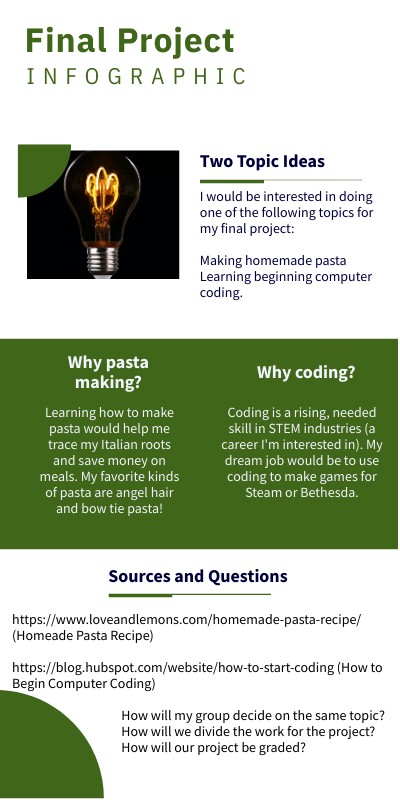 I would be interested in doing one of the following topics for my final project: Making homemade pasta Learning beginning computer coding.