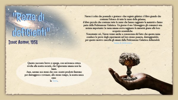Questo racconto breve ci spiega, con un'ironica critica rivolta alla nostra società, che l'ignoranza umana non ha limiti.Anzi, saremo noi stessi che con i nostri prodotti finiremo per distruggerci e rovinare, allo stesso tempo, la nostra unica casa: la Terra.