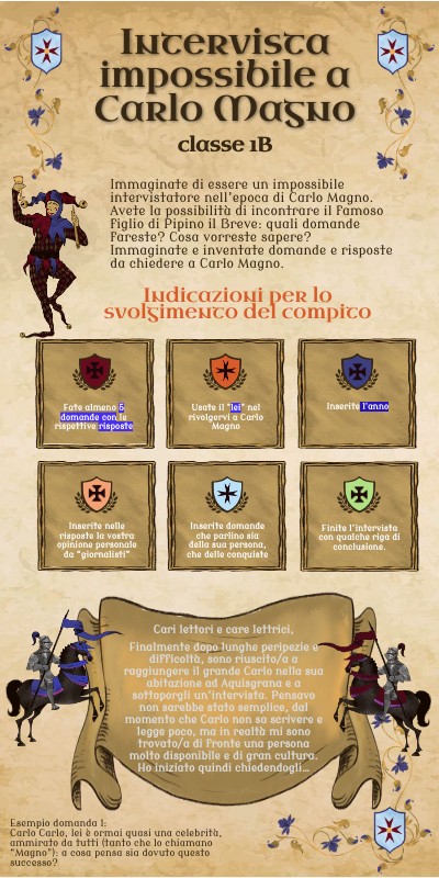 Immaginate di essere un impossibile intervistatore nell’epoca di Carlo Magno. Avete la possibilità di incontrare il famoso figlio di Pipino il Breve: quali domande fareste? Cosa vorreste sapere? Immaginate e inventate domande e risposte da chiedere a Carlo Magno.