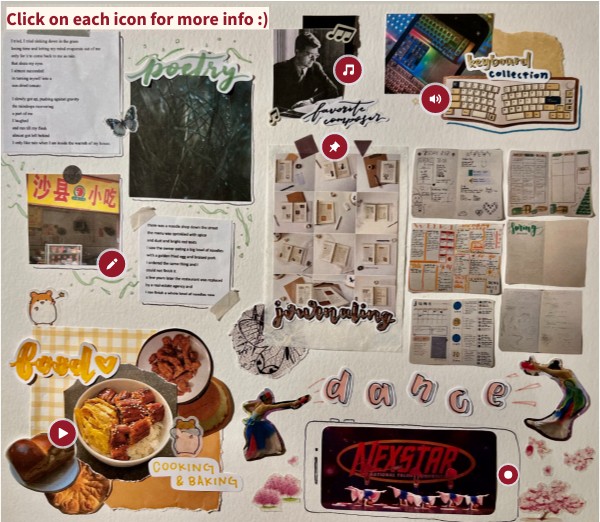 One of my favorite pastimes and coping mechanisms is to journal, or art journal/collaging. So this journal spread is my way of reflecting upon some of my favorite parts of my life. Hope you enjoy! (click on all the icons at each section for more info :)