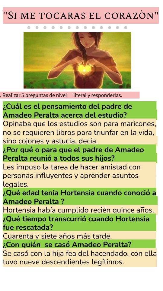 ¿Cuál es el pensamiento del padre de Amadeo Peralta acerca del estudio? Opinaba que los estudios son para maricones, no se requieren libros para triunfar en la vida, sino cojones y astucia, decía. ¿Por qué o para que el padre de Amadeo Peralta reunió a todos sus hijos? Les impuso la tarea de hacer amistad con personas influyentes y aprender asuntos legales. ¿Qué edad tenia Hortensia cuando conoció a Amadeo Peralta ? Hortensia había cumplido recién quince años. ¿Qué tiempo transcurrió cuando Hortensia fue rescatada? Cuarenta y siete años más tarde. ¿Con quién se casó Amadeo Peralta? Se casó con la hija fea del hacendado, con ella tuvo nueve descendientes legítimos.