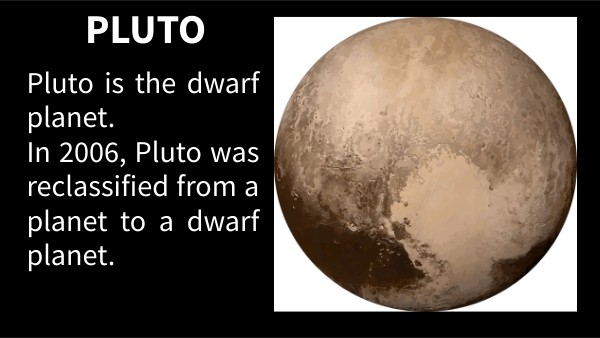 Pluto is the dwarf planet. In 2006, Pluto was reclassified from a planet to a dwarf planet.