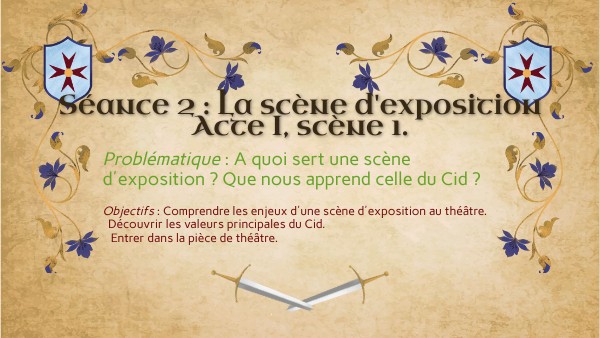 Objectifs : Comprendre les enjeux d'une scène d'exposition au théâtre. Découvrir les valeurs principales du Cid. Entrer dans la pièce de théâtre.