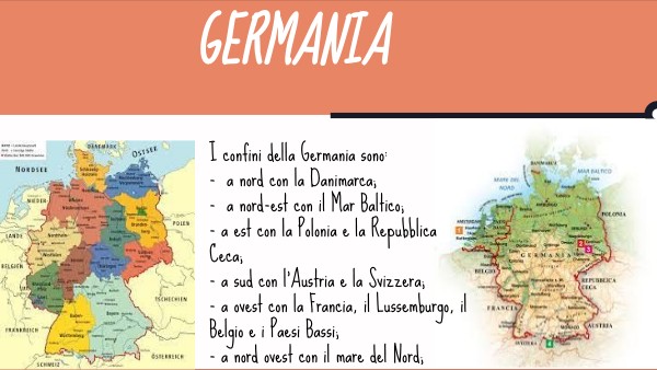 I confini della Germania sono: - a nord con la Danimarca; - a nord-est con il Mar Baltico; - a est con la Polonia e la Repubblica Ceca; - a sud con l'Austria e la Svizzera; - a ovest con la Francia, il Lussemburgo, il Belgio e i Paesi Bassi; - a nord ovest con il mare del Nord;