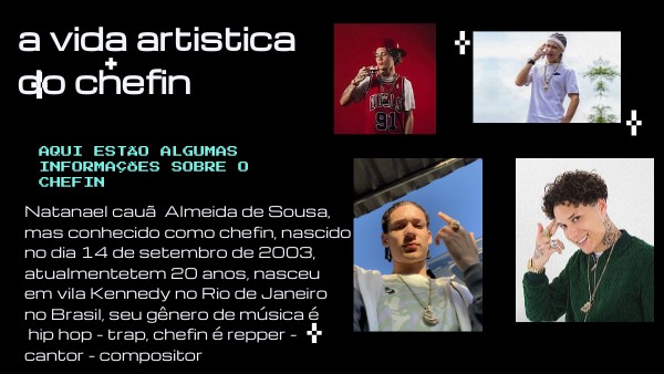 Natanael cauã Almeida de Sousa, mas conhecido como chefin, nascido no dia 14 de setembro de 2003, atualmentetem 20 anos, nasceu em vila Kennedy no Rio de Janeiro no Brasil, seu gênero de música é hip hop - trap, chefin é repper - cantor - compositor