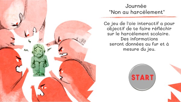 Ce jeu de l'oie interactif a pour objectif de te faire réfléchir sur le harcèlement scolaire. Des informations seront données au fur et à mesure du jeu.