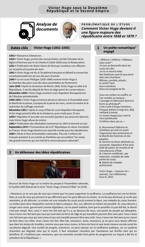 1802 > Naissance à Besancon. 1825 > Victor Hugo, proche des monarchistes, est fait Chevalier de la légion d'honneur par le roi Charles X (1824-1830) sous la Restauration. 1831 > Publication de Notre-Dame de Paris qui constitue une réflexion sur la justice et la peine de mort. 1841 > Victor Hugo est élu à l'Académie française et défend la monarchie constitutionnelle lors de son discours d'entrée. 1845 > Le roi Louis-Philippe (1830-1848) nomme Victor Hugo à la Chambre des pairs (une des deux assemblées du Parlement). Juin 1848 > Après la révolution de février 1848, Victor Hugo se rallie à la République. Il est élu député de Paris et siège parmi les conservateurs. Décembre 1848 > Victor Hugo soutient Louis-Napoléon Bonaparte lors de l'élection présidentielle. 1848-1851 > Victor Hugo prononce plusieurs discours à l'Assemblée pour la liberté de la presse, à propos de la peine de mort, contre la misère et la restriction du suffrage universel. Décembre 1851 > Après le coup d'État de Louis-Napoléon Bonaparte, Victor Hugo prend la tête de la résistance, puis s'exile pour 20 ans. 1859 > Napoléon III accorde une amnistie (pardon) aux proscrits (bannis), mais Victor Hugo refuse de rentrer. 1862 > Publication des Misérables commencé en 1845 et terminé en exil. Septembre 1870 > Proclamation de la IIIe République et retour triomphal en France. Victor Hugo devient une autorité morale pour les républicains. 1885 > Décès à Paris et funérailles nationales. Plus de 2 millions de Français assistent à son entrée au Panthéon qui accueillent "les restes des grands hommes qui ont mérité la reconnaissance nationale".