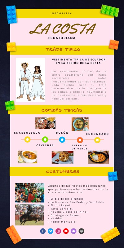Algunas de las fiestas más populares que pertenecen a las costumbres de la costa ecuatoriana son:- El día de los difuntos. - La fiesta de San Pedro y San Pablo - El Inti Raymi. - Tayta Carvajal. - Novena y pase del niño. - Domingo de Ramos. - Navidad. - Rodeo montubio