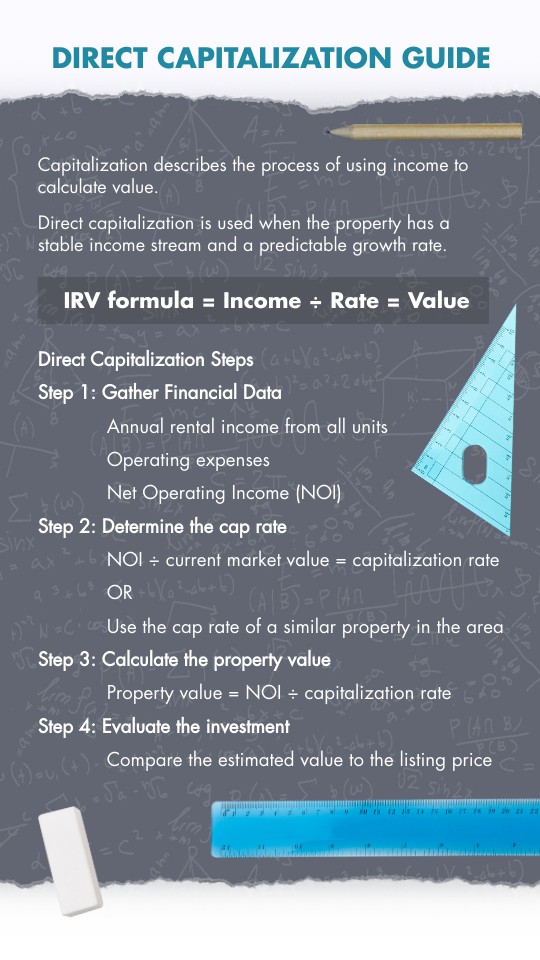 Direct Capitalization Steps Step 1: Gather Financial Data Annual rental income from all units Operating expenses Net Operating Income (NOI) Step 2: Determine the cap rate NOI ÷ current market value = capitalization rate OR Use the cap rate of a similar property in the area Step 3: Calculate the property value Property value = NOI ÷ capitalization rate Step 4: Evaluate the investment Compare the estimated value to the listing price