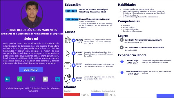 Hola, ¡Mucho Gusto! Soy estudiante de la Licenciatura de Administración de Empresas. Soy una persona trabajadora en busca de empleo, preparado para utilizar mis distintas habilidades y pasión para impulsar la misión de una compañía. Hábil en el sistema tecnológico con experiencia en plataformas sociales, programas básicos Word, power point, Excel, Canva y habilidades informáticas avanzadas. Aporto una actitud positiva y motivación para aprender y generar más conocimientos en la utilización de nuevos programas.