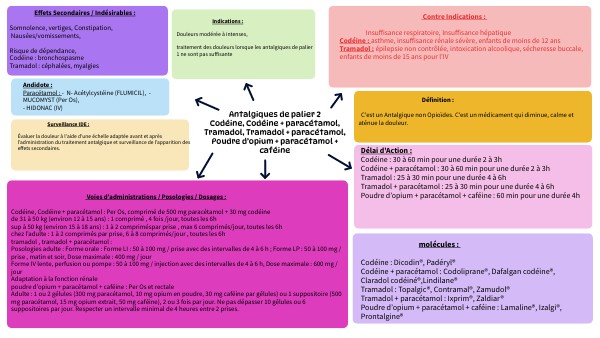 Indications : Douleurs modérée à intenses, traitement des douleurs lorsque les antalgiques de palier 1 ne sont pas suffisante