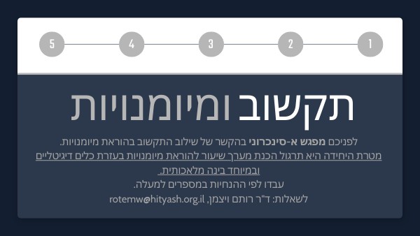 לפניכם מפגש א-סינכרוני בהקשר של שילוב התקשוב בהוראת מיומנויות. מטרת היחידה היא תרגול הכנת מערך שיעור להוראת מיומנויות בעזרת כלים דיגיטליים ובמיוחד בינה מלאכותית. עבדו לפי ההנחיות במספרים למעלה. לשאלות: ד"ר רותם ויצמן, rotemw@hityash.org.il