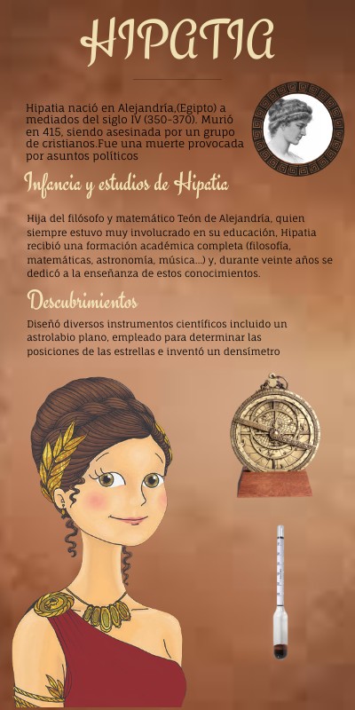 Hija del filósofo y matemático Teón de Alejandría, quien siempre estuvo muy involucrado en su educación, Hipatia recibió una formación académica completa (filosofía, matemáticas, astronomía, música…) y, durante veinte años se dedicó a la enseñanza de estos conocimientos.