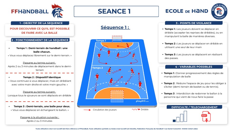 - Temps 1 : Demi-terrain de handball : une balle chacun.